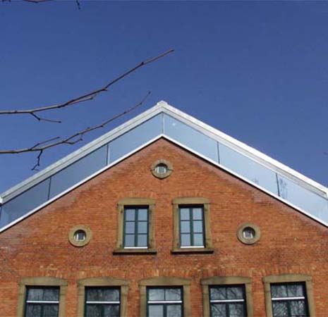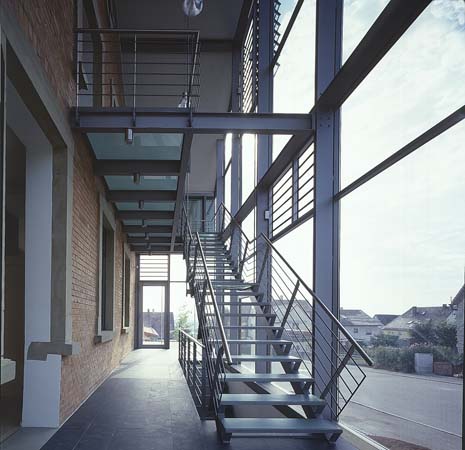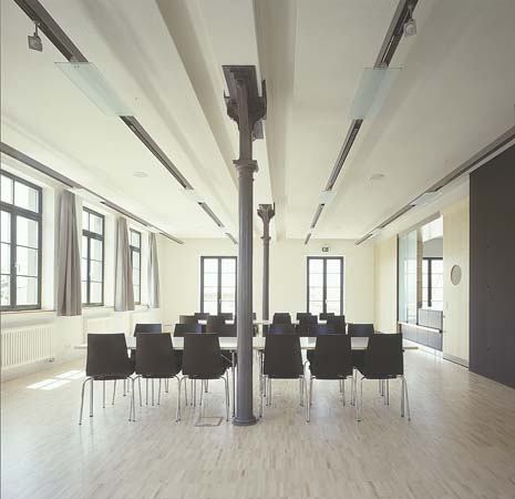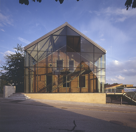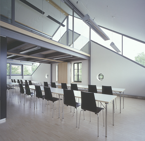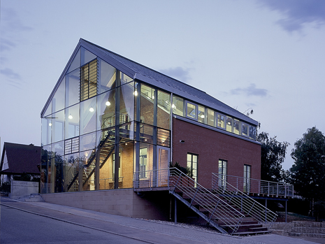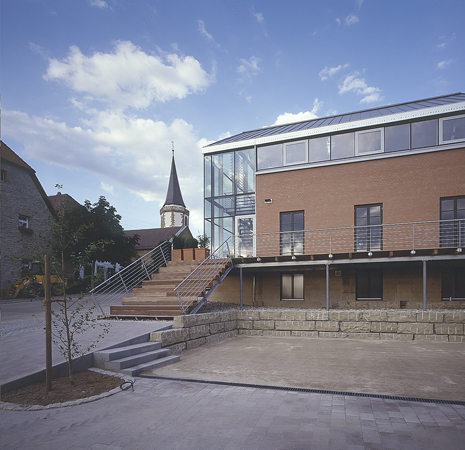 In direkter Nähe zur Kirche und Pfarrscheune entstand 1890 das Schulhaus. Um das Raumprogramm mit Räumen für die Landfrauen, Altenclub und Volkshochschule zu realisieren, musste das alte Schulhaus erweitert werden. Die transparente Aufstockung sowie die gläserne Erschließungszone entwickeln sich aus dem alten Schulhaus heraus. Das Neue stellt sich entsprechend eines neuen Jahresrings dar. Das Neue ist ablesbar, ohne jedoch das alte Schulhaus zu verstellen und zu verstecken. Das neue Dach ragt prägnant in den Straßenraum hinein. Der gläserne Vorbereich lässt die historische Ziegelfassade erlebbar sein. Der Altbau bleibt zur Identifikation erhalten. Die Transparenz in allen Räumen ermöglicht großzügige Ausblicke in die schöne Landschaft. Eine vorgesetzte Terrasse auf der Westseite erweitert den Saal ins Freie. Alle konstruktiven Maßnahmen und Einbauten wurden dem Thema „historischer Altbau – filigrane, zurückhaltende und transparente Ergänzungen“ zugrunde gelegt. Die Anhebung des Daches erfolgte durch eine filigrane, freistehende und vom Bestand unabhängige Stahlkonstruktion, die den neuen Holzdachstuhl mit leichter Dachdeckung trägt. Die Galerieebene wurde als eigenständige Stahlkonstruktion eingehängt.