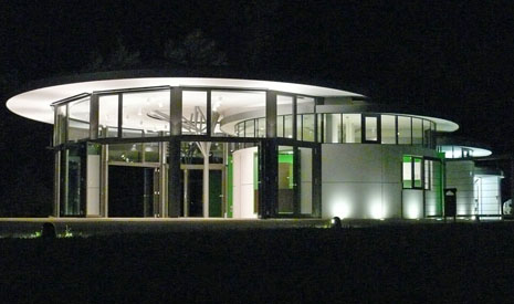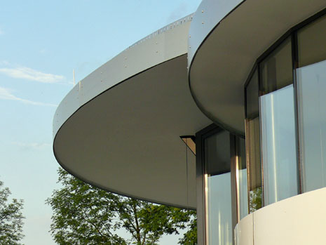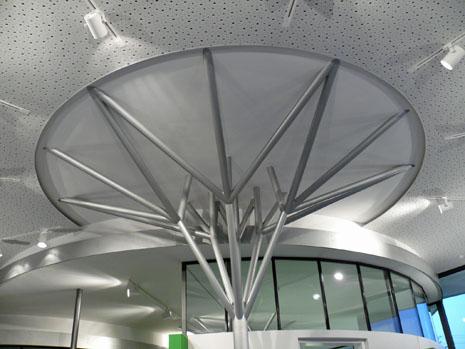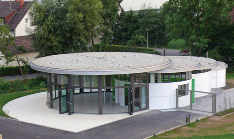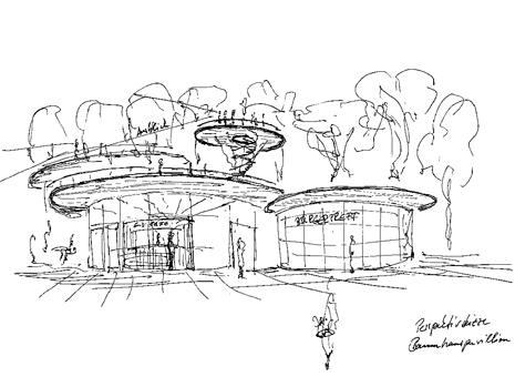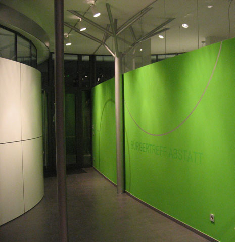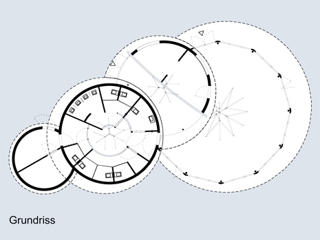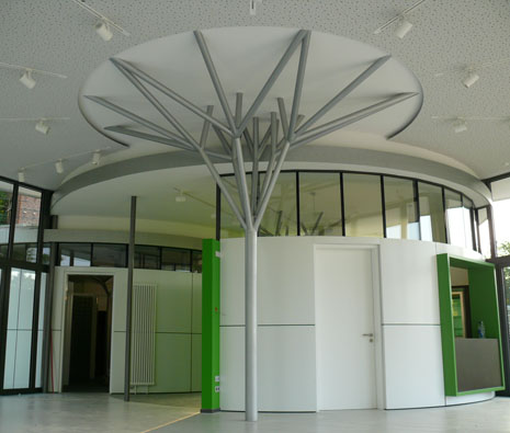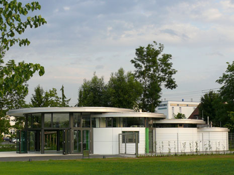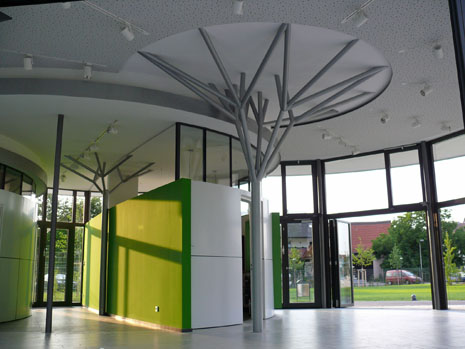 Stilisierte Stahlbäume als Tragstruktur tragen die aufgelegten Holzplattformen der Dächer. Da das Gebäude im Kontext des neuen spielerischen Bürgerparks mit seiner bewegten textilen Architektur der Tribünenüberdachung steht, findet der Park in der organischen Architektursprache des Bürgertreffs seine folgerichtige Abrundung. Durch die klare Formulierung der einzelnen Bereiche und durch die deutliche Höhenstaffelung lassen sich von außen die unterschiedlichen Nutzungen ablesen. Der Gastraum hat durch die verschiebbaren Glasfassaden einen deutlichen Außenraumbezug. Dadurch kann er selbst zum Außenraum werden und man hat auch das Gefühl, unter Bäumen zu sitzen.