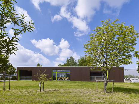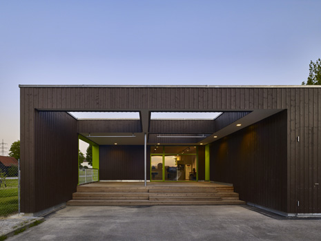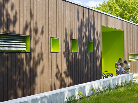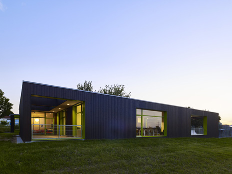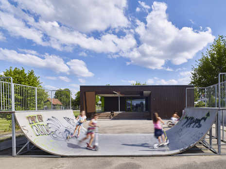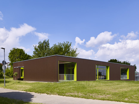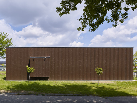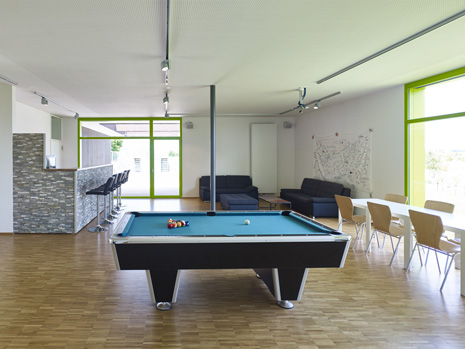 Das langgestreckte Grundstück liegt am Ortsrand von Neckarwestheim und wurde bereits vom Jugendhausverein als Hobbyland mit Clubraumcontainer genutzt. Der umgesetzte Wettbewerbserfolgs ermöglichte es, während der gesamten Bauzeit die bisherige Einrichtung nutzen zu können. Der Entwurf nimmt die Ausrichtung des Grundstückes auf und entwickelt sich als kubisch Baukörper mit Ausschnitten für Innenhöfe parallel zum Wacholderweg hin. Der Zugang erfolgt über eine großzügige Vorzone und ist als deutliche Adresse erkennbar. Die klare und einfache Grundrissstruktur unterstreicht die Zweckmäßigkeit des Neubaus. Das Jugendhaus öffnet zu den beiden Innenhöfen sowie zum Grünzug auf der Nordseite. Dadurch verringert sich die Einsehbarkeit in das Innere des Gebäudes, es entstehend geschützte Bereiche mit unterschiedlicher Aufenthaltsqualität. Die verbindende Außentreppe zwischen Jugendhausebene und Hobbyland dient als Kommunikationsbereich und Tribüne. Das Gebäude ist zum Wohn-/ Industriegebiet hin geschlossen, um den Geräuschpegel für die Umgebung gering zu halten. Eine einfache Tragstruktur ermöglicht eine Großzügigkeit, die ein Verzahnen mit der Natur und gleichzeitig eine Intimität innerhalb der Räume erzeugen lässt. Der große Aufenthaltsraum wird über den Zugang erschlossen und ist zentraler Verteilerpunkt, die Büros, ein kleinerer rückgezogener Gruppenraum sowie die Gemeinschaftsküche sind angegliedert. Jede Nutzungseinheit erhält einen eigenen Außenbereich. Das Gebäude ist als Holzbau auf einer massiven Bodenplatte konzipiert. Dachüberstände/Innenhofüberdachungen dienen als passiver Sonnenschutz/Witterungsschutz. Die Fassade besteht aus einer braun gebeizten Deckelschalung und nimmt somit den Duktus der landschaftstypischen Scheunen auf. Die tiefen Fensterleibungen werden mit apfelgrünen Laibungsbrettern gefasst. Dies gibt dem Gebäude sein typisches Aussehen. Die „Fensterlesekiste“ auf der Ostseite dient der Ornamentik der geschlossenen Fassade. Im kleinen Gruppenraum wird diese Lesekiste als Rückzugsort, hier kann gelesen, oder die Landschaft geschützt bestaunt werden.