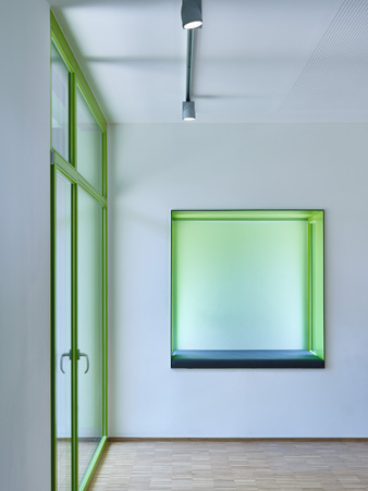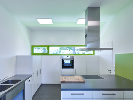 Großzügige Verglasungen schaffen lichtdurchflutete Räume. Aufgrund der Ausrichtung nach Nord und dem passiven Sonnenschutz kann eine Überhitzung verhindert werden.