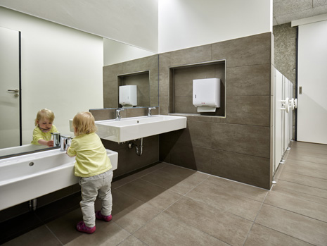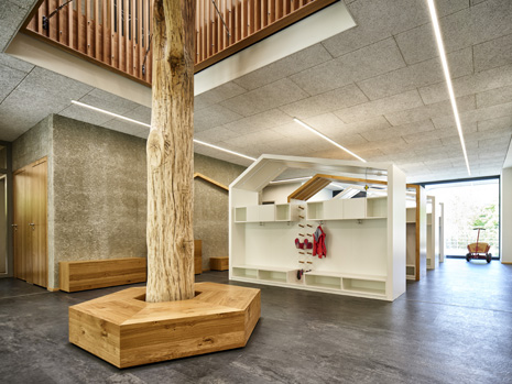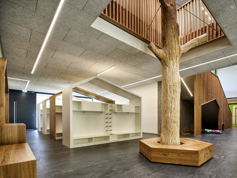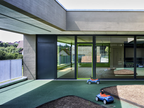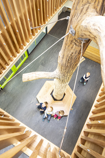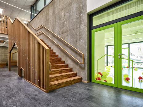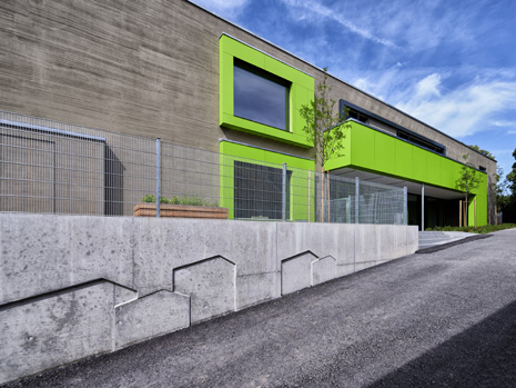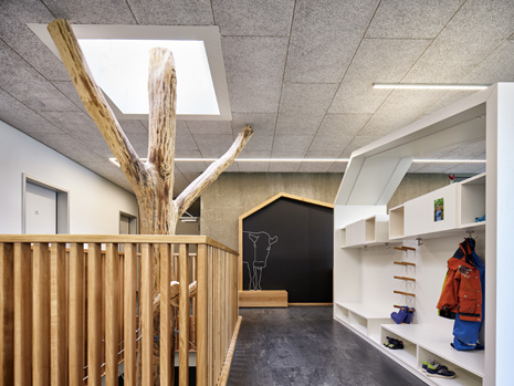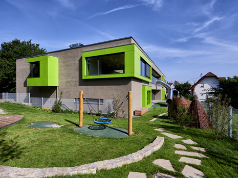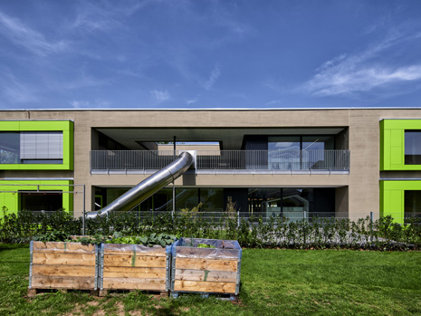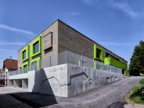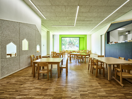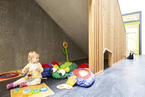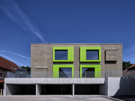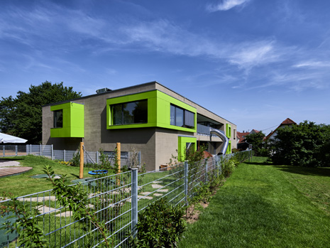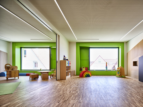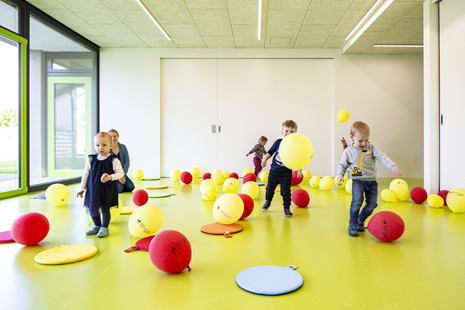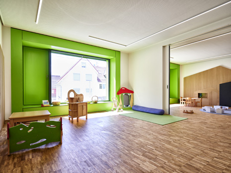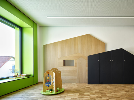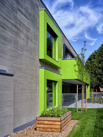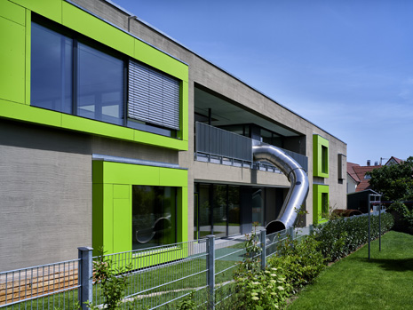 Im Mai 2019 war es endlich soweit und die neue Kita hat nach 2 Jahren Planungs- und Bauphase ihre Tore für die kleinsten Abstätter geöffnet. Für alle Mitwirkenden, die Gemeinde, die Planer, die Handwerker und auch die späteren „Dorfbewohner“ geht mit dem Start des Kita-Betriebes eine ereignisreiche und intensive Zeit mit viel Vorfreude zu Ende. Nun kann eine noch spannendere Zeit, gefüllt mit vielen Erlebnissen, neuen Erfahrungen und kleinen und großen Abenteuern beginnen.Die neue Kita, als kompakte Hülle geplant, empfängt die Kinder im Inneren als kleines Dorf mit eigenem Rathaus (Leitungsbüro), Festwiese zum Spielen und Toben (Bewegungsraum), einer Gaststätte (Mensa), vier guten Stuben (Gruppenräume) und einem Dorfplatz mit Dorfeiche als Treffpunkt für alle. Viel Platz um die Tage in der Kita phantasievoll, lebendig und immer wieder neu zu gestalten. Die vier Gruppenräume „Kirschenwiesen“, „Apfelgarten“, „Krautgarten“ und „Talwiesen“ verdeutlichen mit ihren Namen die Ortsverbundenheit zu Abstatt und lassen Tradition spielerisch in den Kindergartenalltag mit einfließen.Im linken Bereich der Kita befinden sich pro Geschoss zwei Gruppenräume mit eigenen Schlaf- und Intensivräumen und einem gemeinsamen Sanitärkern. Sind die großen Schiebetüren geöffnet, können die zwei Gruppenräume sich zu jeweils einem Spielbereich vereinen.Im rechten Bereich der Kita ist im Erdgeschoss die Mensa für die Kleinen angeordnet, sowie der Bewegungsraum und die Räumlichkeiten für die Kitaleitung und ein Elternzimmer. Im Obergeschoss befinden sich ein großer Personalraum und die Mensa der angrenzenden Grundschule. Für die Kinder im Obergeschoss gibt es zudem eine große Außenterrasse mit Pflanzbeeten und Bobbycar-Rennstrecke. Über eine große Rutsche können die Kinder spielerisch aus dem Obergeschoss in den Garten gelangen. Im Brandfall wird dieser Weg zur Evakuierung genutzt.Die Fassade der neuen Kita erfährt durch ihre individuelle Oberflächenstruktur einen eigenen ausdrucksstarken Charakter. Der horizontale Besenstrichputz, gewollt unregelmäßig, erzeugt ein wirkungsvolles Spiel aus Licht, Schatten und Plastizität. Akzentuiert wird das Gebäude innen und außen durch apfelgrüne Fensterkisten, die sich aus der Fassade herausschieben. Als Sitzelemente können diese in die Möblierung mit einbezogen werden. Sie laden zum Verweilen, Hinausschauen und Träumen ein.Unterhalb der Kita befindet sich eine Tiefgarage mit 23 PKW-Stellplätzen, sowie verschiedenen Lager- und Nebenräumen. Das Tiefgaragendach dient als Plateau für den Außenbereich der Kita.Das „kleine Dorf“ wird schon jetzt und sicherlich auch in Zukunft mit viel Ideenreichtum und Kreativität gelebt.