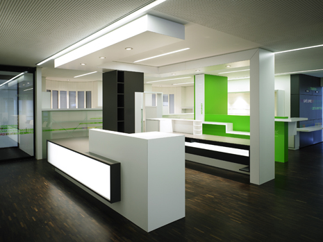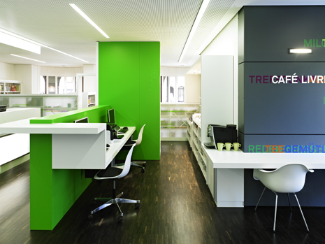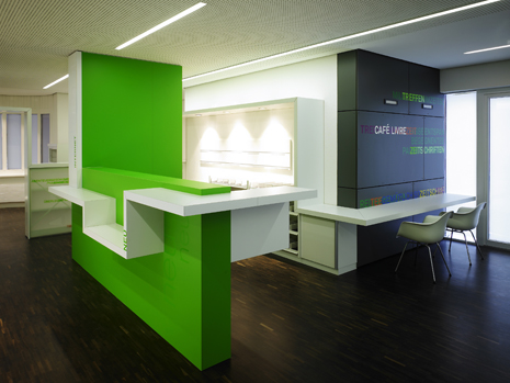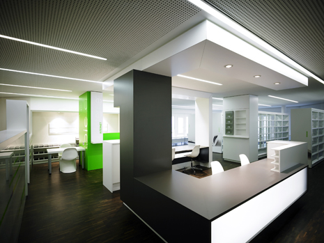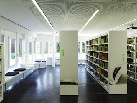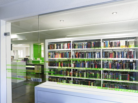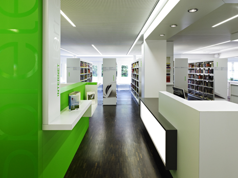 Die Infotheke als Hauptanlaufstelle liegt zentral in der Mitte. Durch die Stellung der Bücherregale ergibt sich eine Durchlässigkeit in Blickrichtung. Die Bücherregale werden durch weiße, gefaltete Schichtstoffbänder zusammengefasst, vermitteln optisch Ruhe und führen geordnet durch den Raum. Farben, mit denen die Bücher zum Sortieren versehen sind, werden auch zur Orientierung im Raum genommen. Die Anordnung der Bereiche ist logisch und dem Alter entsprechend, aufeinander aufbauend. Dies spiegelt sich auch in der Höhe der Bücherregale wider, die mit dem zunehmenden Alter höher werden. Durch die Faltung der Regalverkleidung ergeben sich Ablagemöglichkeiten.