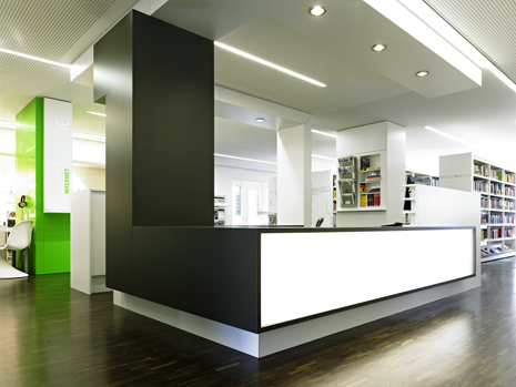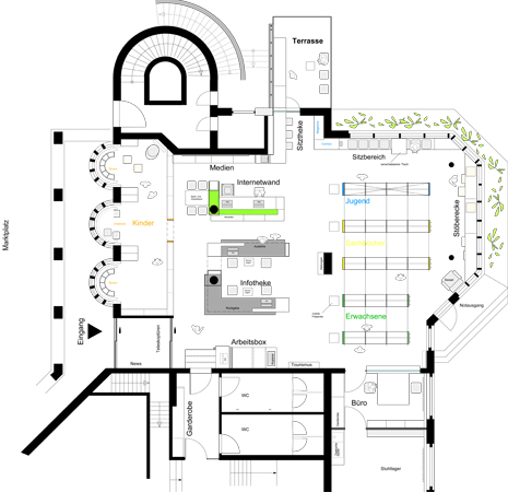 Die Bibliothek soll hell, übersichtlich und großzügig erscheinen. Die Anordnung muss so sein, dass der Besucher sofort am Eingang überblicken kann, wo welcher Bereich zu finden ist.