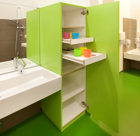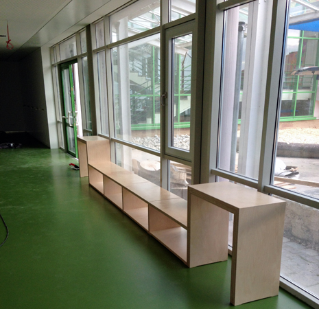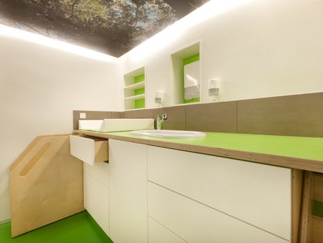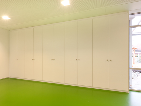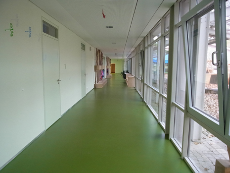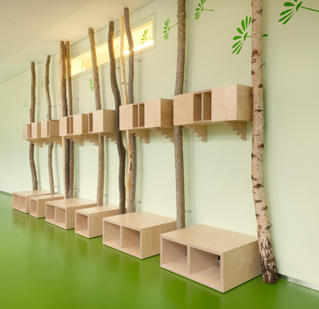 Die Stadt Beilstein beabsichtigte, eine Kinderkrippe für 2 Gruppen in die ehemaligen Hautschulräume des Schulkomplexes in Beilstein als Interimslösung umzusiedeln. Die Idee des räumlichen Konzepts war, den langen Flur als Garderobe und als Spielflur im Stil eines Waldes zu gestalten. Die Farbgebung wurde somit der Natur angepasst. Holzstämmchen dienen als Garderobenhalter. Holz als haptische Elemente, gepaart mit moosgrünem Boden. An dem Flur entlang reihen sich die von außen direkt angediente Küche mit Essbereich, ein großer Mehrzweckraum, der als großer Bewegungsraum und mit einer mobilen Trennwand als abgetrennter Schlafraum genutzt werden kann, 2 Gruppenräume sowie ein weiterer Schlafraum auf.