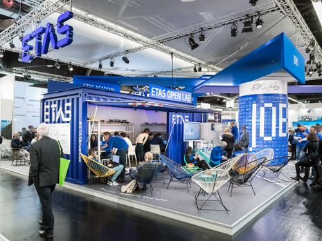 Zentral auf dem Messestand in Nürnberg 2019 befindet sich der ETAS Container, an dem sich Bar und Präsentationsfläche befinden. In dem Container selbst findet sich das Labor zum Mitmachen für die Standgäste. An den umlaufenden Standkanten stehen Demotische zu den einzelnen Ausstellungsthemen. Die Grundfarben des Messestands sind in Schwarz auf der Bodenfläche, Weiß und ETAS-Blau gehalten. Graphiken auf dem Boden der Standfläche greifen die Urbane Thematik auf und schafft eine städtebaulich inspirierte Standeinteilung welche das ETAS Thema unterstützt. Über dem Messestand schwebt eine Kreuzförmige Deckenabhängung welche den Raum des Messestands definiert und von weithin sichtbar ist.