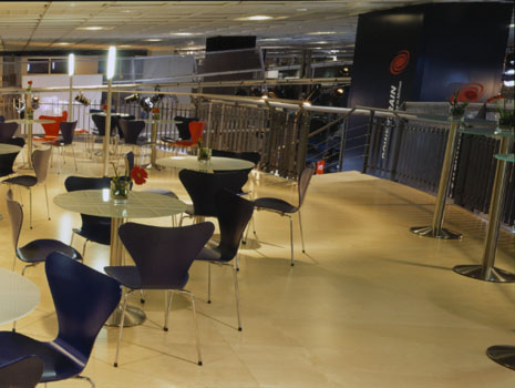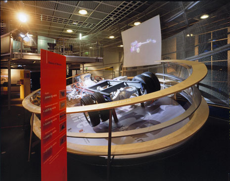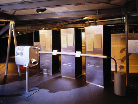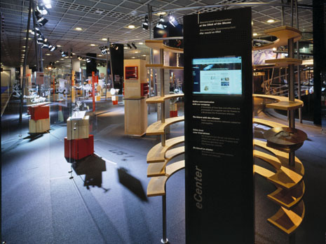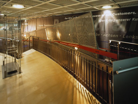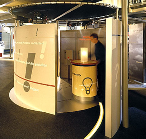 Dieser Messestand für Powertrain Business Unit basiert auf dem Logo “Wirbel”, der dreidimensional umgesetzt wird, sowie der Charakteristik des Geschäftsbereiches der DaimlerChrysler AG: Präzision, Dynamik, Transparenz und Innovation. Weitere Themen wie Reflexion, Spiegelung, Durchblicke/Einblicke sowie das Schaffen von unterschiedlichen Atmosphären für unterschiedliche Aufenthalts- und Nutzungsbereiche sind für das Architekturkonzept von Bedeutung. Einzelaggregate, Modulaggregate und Systemkompetenz bilden die Achsen. “Future in Motion” lautet der Slogan. Diverse Attraktionen wie interaktive Exponate, historischer Antriebstrang, dynamischer Antriebstrang mit “ferngesteuertem” LKW ziehen die Besucher auf den Messestand. Sie erleben einen dynamischen und transparenten Messestand mit angenehmer, offener Atmosphäre. „Stear by wire“ wurde mit der Entwicklungsabteilung, welche den technischen Input gab, entworfen. Das Exponat wurde in den Gesamtkontext gestellt und messetauglich und leicht verständlich umgesetzt. Über das Exponat wurde ein LKW in 400 KM Entfernung gesteuert. Die Fahrt wurde in Echtzeit auf die große Leinwand übertragen. Gleichzeitig wurde dem Messebesucher seine Steuerungsaktionen am davor präsentierten Antriebstrang dargestellt. Trockene Inhalte, wie Abgasreinigung, Globalisierung und Qualitätsmanagement (Iso 9001) wurden über interaktive Exponate vermittelt. Diese Exponate wurden von uns entwickelt.