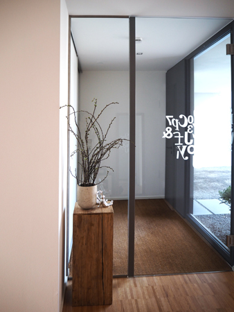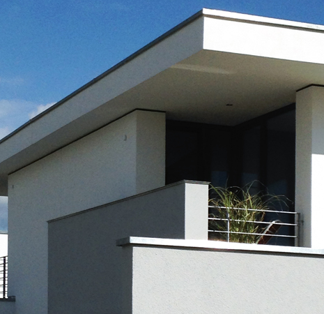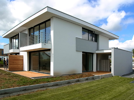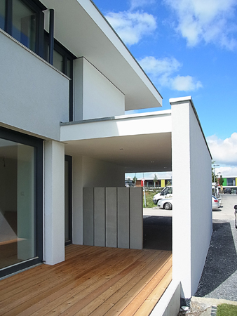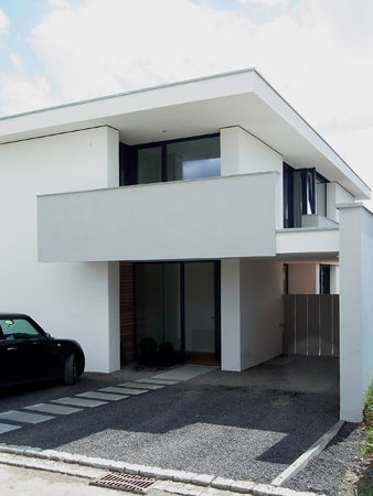 Das Doppelhauses wurde als ausdruckstarkes Wohnhaus in der amorphen Neubaustruktur erstellt. Vorbild ist die klassische Villa mit ringsum auskragender Dachscheibe. Der darunter liegende Baukörper wird in stehende und liegende Wandscheiben aufgelöst. Durch die Unterschiedlichkeit der Ausprägung der Auflösung wird das Erscheinungsbild als Doppelhaus überspielt. Die durch das Spiel der Flächen entstehenden Öffnungen werden als Glasflächen angelegt. Durch Einschnitte im Kubus ergeben sich die beiden geschützten Zugänge für die jeweilige Doppelhaushälfte. Die großzügige Verglasungen nach Süden ermöglichen ein lichtdurchflutetes Haus. Arrondierende Überdachungen an den Längsseite gegeben u.a. einen geschützten Freibereich. Die Grundrissorganisation im EG ermöglicht ein kompaktes, aber großzügiges Wohnen. Alle Zimmer sowie das Bad haben einen eigenen Freibereich und einen hohen Verglasungsanteil.