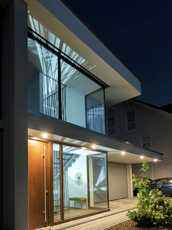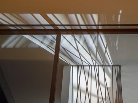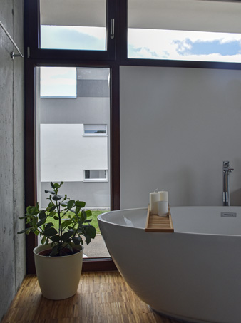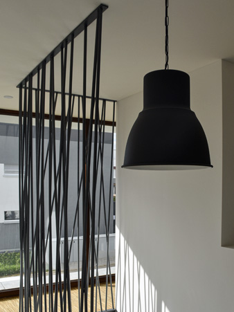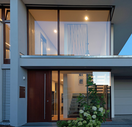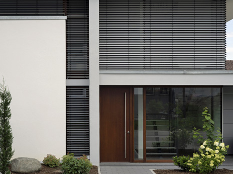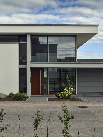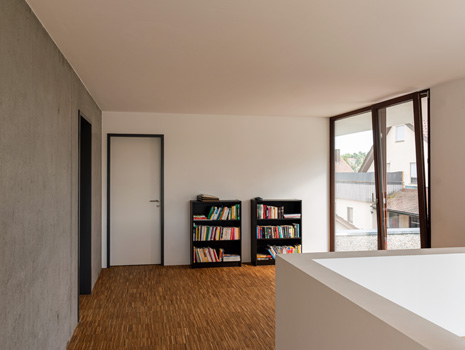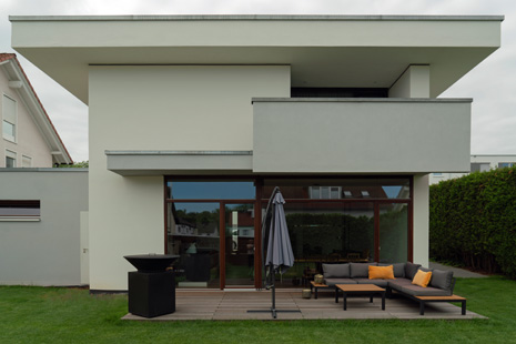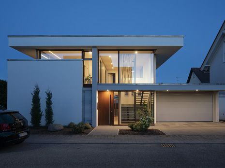 Der Neubau des Einfamilienhauses in Abstatt ist als lichtdurchfluteter Kubus konzipiert, der von stehenden und liegenden Wandscheiben geprägt ist. Diese ergeben im Zusammenspiel die räumliche Aufteilung. Durch eine dezente Farbgebung werden gezielt Flächen hervorgehoben, die dem Gebäude seine ausdrucksstarke Ornamentik geben.Die durch das Spiel der Flächen entstehenden Öffnungen werden als Glasflächen angelegt, die viel Licht ins Innere des Gebäudes bringen. Der Eingangsbereich ist deutlich als Adresse ablesbar. Die Aufenthaltsräume im Obergeschoss sind zusätzlich durch vertikale Wandscheiben vor fremden Einblicken geschützt.Großzügige Verglasungen nach Süden sowie zu den Terrassen im OG zu allen Seiten ermöglichen ein lichtdurchflutetes Haus. Der im Erdgeschoss durchweg offene Grundriss ermöglicht spannende Blickbeziehungen. Die Räume ordnen sich entlang einer zentralen Achse, die von Nord nach Süd verläuft und durch eine Sichtbetonwand hervorgehoben wird. Der Wohnbereich geht dank der Verglasung optisch in den Garten über.Im Vergleich zum Eingangsbereich liegen die übrigen Räume im Erdgeschoss tiefer. Durch die daraus resultierende Deckenhöhe von drei Metern, öffnet sich der großzügige Wohnbereich zusätzlich.Durch die mehrgeschossige Verglasung im Eingangsbereich entsteht je nach Lichteinfall mithilfe der Geländerkonstruktion ein spannendes Spiel aus Licht und Schatten, das bis in den öffentlichen Raum hineinragt. Die Lage der Treppe ist bewusst so gesetzt, dass das Gebäude später in zwei Wohnungen unterteilt werden kann.