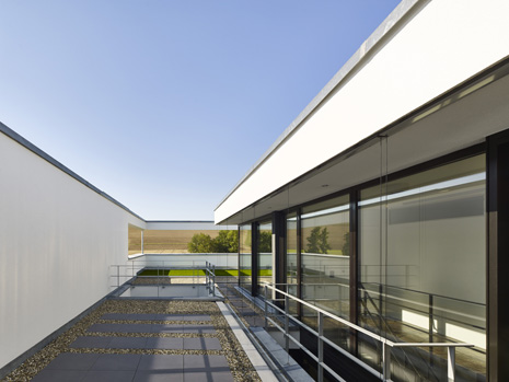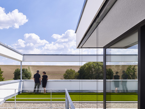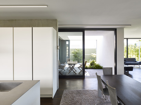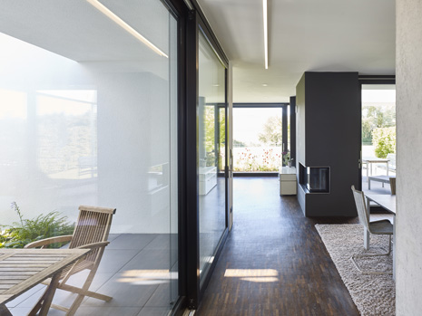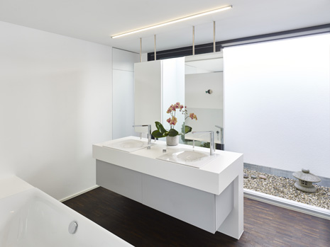 Verschiedene Innenhöfe bringen Licht in die Mitte des Gebäudes und erlauben spannende Sichtbeziehungen nach außen. Im Obergeschoss ermöglichen sie geschütztes Ruhen und, durch die vollflächige Verglasung, maximale Helligkeit bei maximaler Intimität im Badezimmer.