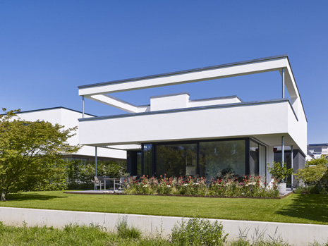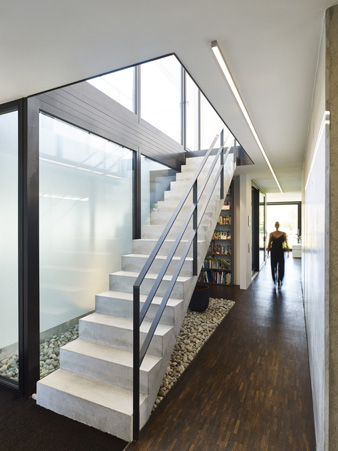 Die Grundrissgestaltung folgt den Prinzipien einer Stadt mit ihren Wegen und Plätzen. Der Flur im Erdgeschoss wird zum Weg entlang eines Skulpturengartens. Vorbei am östlichen Innenhof auf der einen Seite und dem Essbereich auf der anderen Seite erreicht man das große Wohn- und Kaminzimmer. Durch allseitig bodentiefe Fenster bietet dieser Teil des Hauses einen maximalen Bezug zum Außenraum und geht fließend in den gradlinig angelegten Garten über.