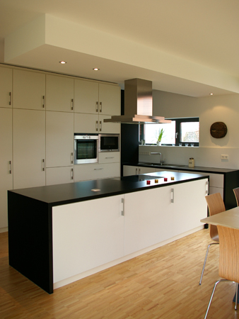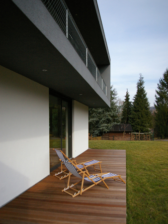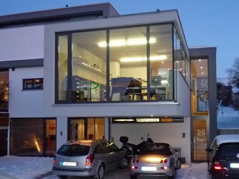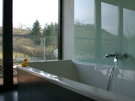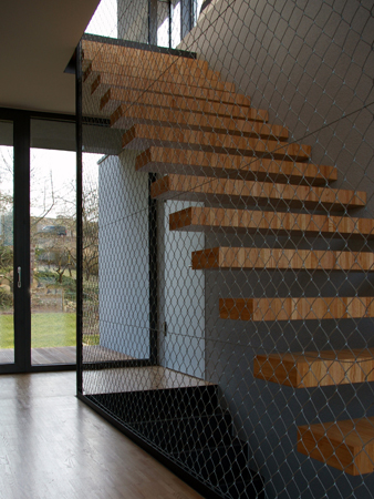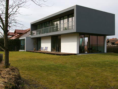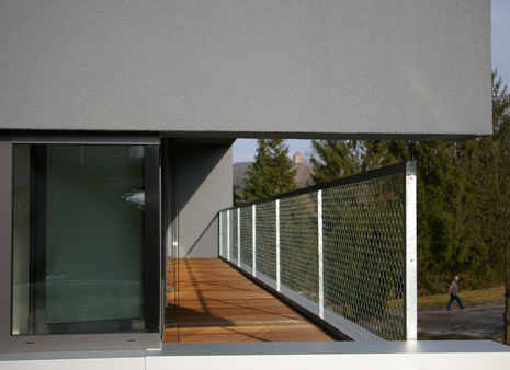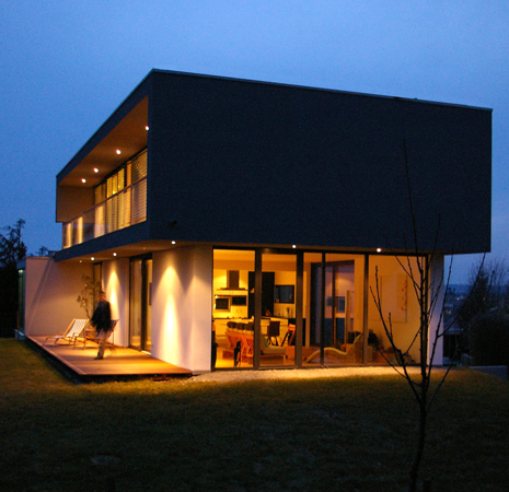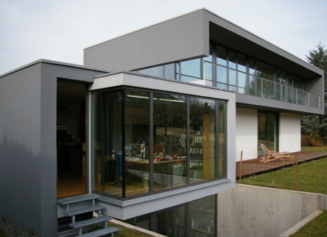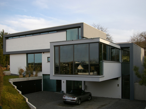 Am Ortsrand, direkt an Streuobstwiesen und Weinbergen, entstand auf einem länglichen, leicht nach Norden abfallenden Grundstück dieser Neubau. Die besondere Bauaufgabe, im Gebäude auch ein großzügiges Büro unterzubringen lösten wir, indem wir den Neubau als „Doppelhaus" konzipierten. Der prägende bauliche Bügel, in Form einer stilisierten aufgeklappten Büroklammer, verbindet beide Nutzungseinheiten. Der weit auskragende Büroriegel durchstößt den Raumbügel; es entstehen zwei getrennte Lebensräume. Der Bürobereich orientiert sich gänzlich in den öffentlichen Freiraum, nach Nordwesten. Der Wohnhaustrakt orientiert sich gänzlich zum Naturerlebnis hin, nach Südosten. Großzügige Verglasungen tragen der außergewöhnlichen Lage des Gebäudes Rechnung. Innen- und Außenraum verschmelzen zu einem Gesamtraum. Das gläserne Treppenhaus mit seiner filigranen eingespannten Treppe bildet die Vorzone für die jeweiligen Nutzungseinheiten in den drei Geschossen; mögliche Einliegerwohnung oder Büronutzung im Hanggeschoss, Wohnbereich im Gartengeschoss und Schlafbereich im Obergeschoss. Die Transparenz lässt das Haus durchschaubar und erlebbar werden